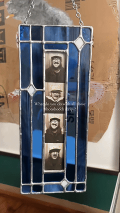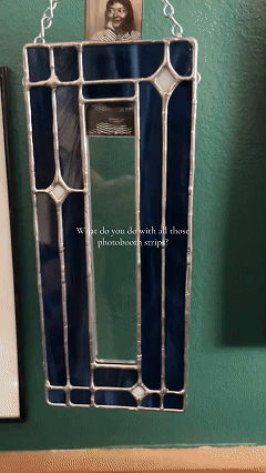 This handcrafted frame is designed for photo booth strips. Featuring a geometric border crafted with the classic copper foil (stained glass) technique, each frame is a unique work of art. Multiple frames interlock vertically to create an ever-growing, radiant gallery of memories.